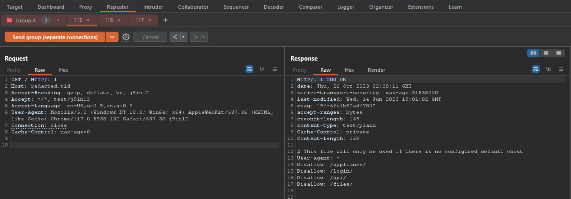 It worked! After 6 attempts, the smuggled request was working. By changing the verb, path and content-length to reflect the values, I was able to get the smuggled endpoint and verb by accessing the main site using tab 1 (the normal GET). This means that when a user tries to access https://redacted.tld/ they will be redirected to https://redacted.tld/robots.txt without them doing anything other than accessing the same endpoint we poisoned, in this case, the / folder.