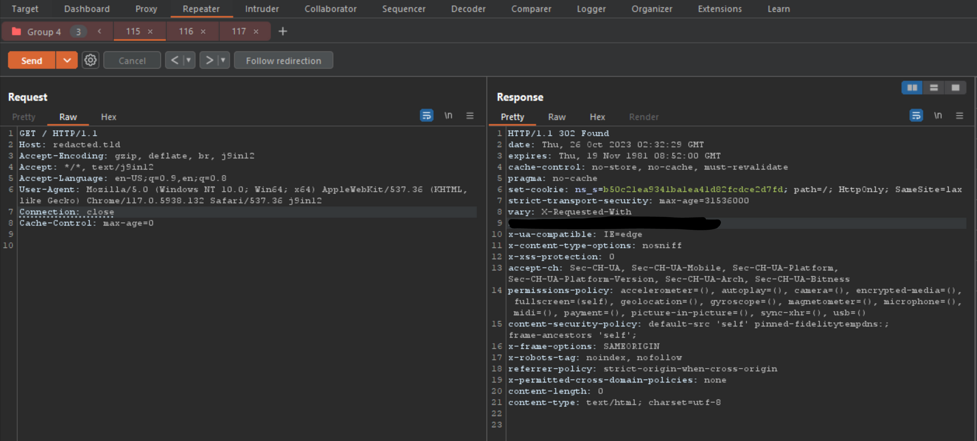 The above command simply loops over and makes a request to https://redacted.tld/ and prints the status code. We should be expecting the status code to remain a 302 if the smuggle doesn't work globally. If we switch the status code to a 200, that means the smuggle is not only effecting the local session, but it is also effecting the network wide cache as well. While the loop is running in the cloud, go back to Burp-Suite and press the send button 5 to 10 times again, then go back and check the cloud VM output.