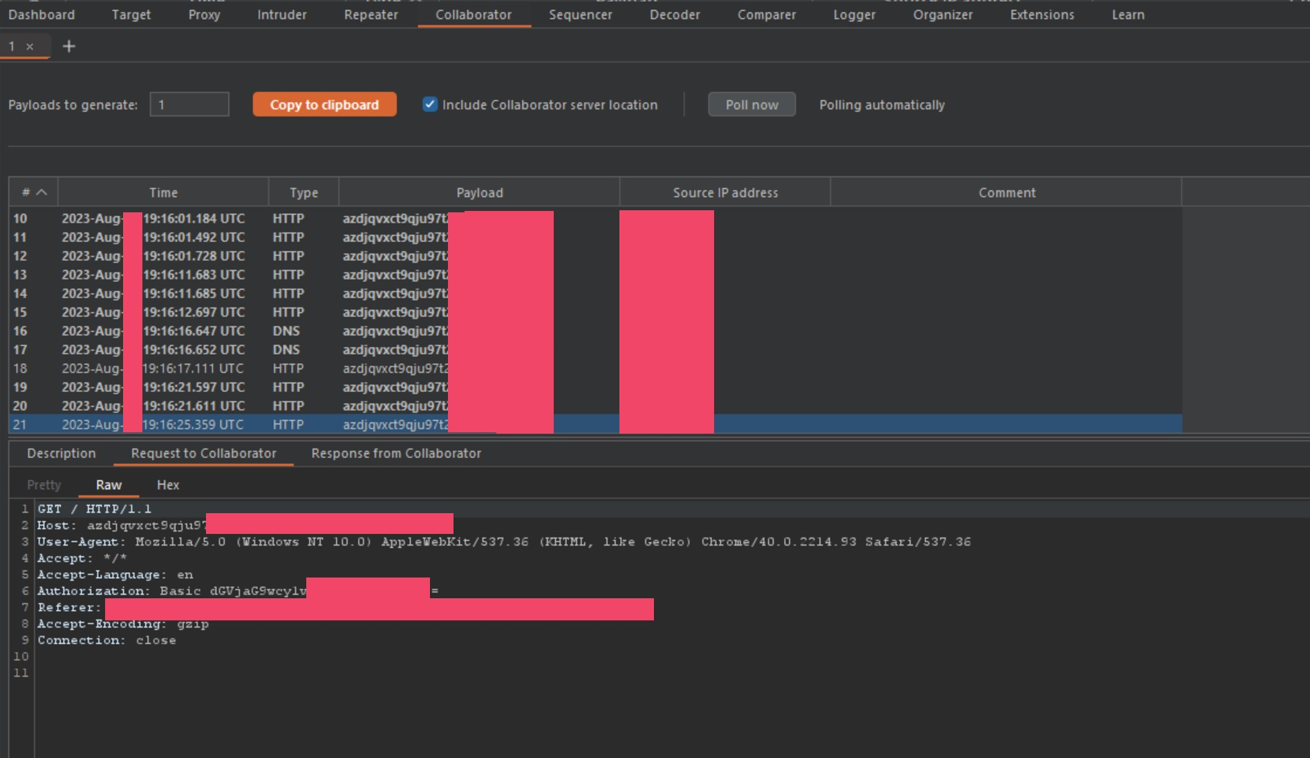 After spamming the send button with our collaborator payload instead of proof-of-concept one from before, we start to get the following callbacks to collaborator.