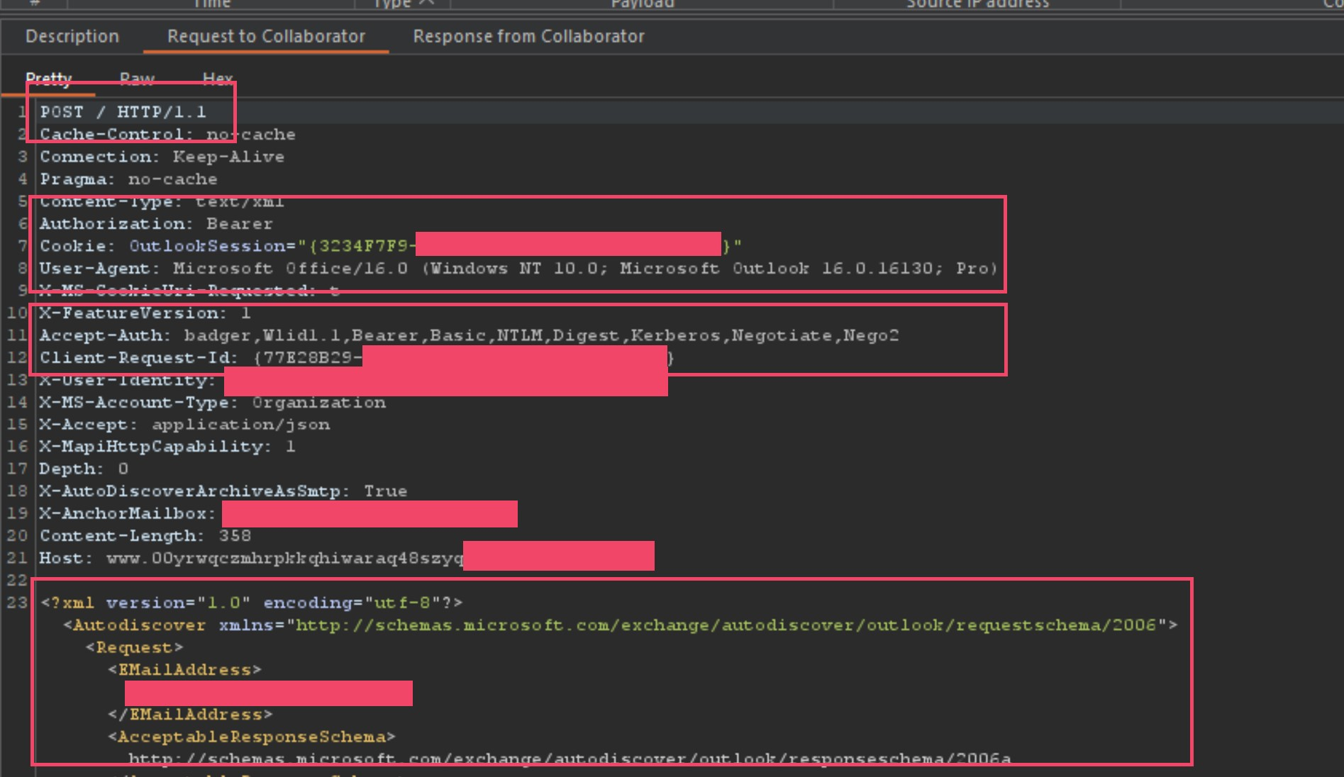 I thought, what in the hell is this?! A POST request captured on a host injected smuggle gadget?! I understand why the callback server would receive some GET requests, this is normal, but I wasn't used to seeing POST requests. This was VERY interesting to me, so I keep poisoning this specific domain to steal all the HTTPS traffic to see if this was a one-off, or some kind of Microsoft configuration using the vulnerable domain as its Auto-Discover host? During my attack, I found 2 more users sending POST requests, leaking some internal information like the first I found. I am no Microsoft Internals expert, especially when it comes to Office365/Outlook/Exchange configurations, to say the least, but I did know enough to understand what this line in the request meant.