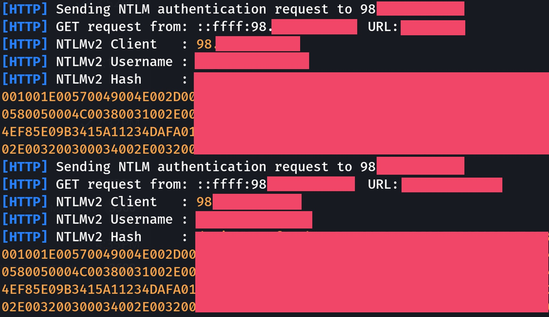 For the first few hours of checking periodically, I was getting traffic, but nothing was sending NTLM credentials. I thought maybe this was too good to be true, or that the POST requests from the Windows machines were not common, and may have to sit longer term to trigger the authentication process... but just as I was starting to think this was a bad idea, I got the following reply in Responder.