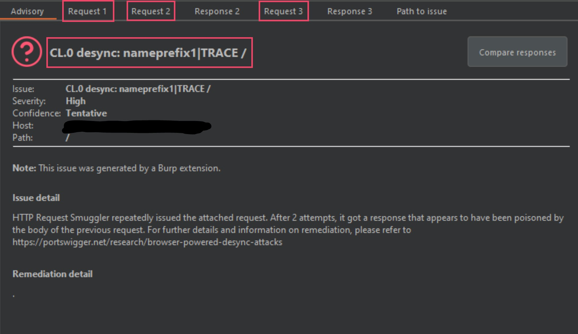 Request 1 will always be a normal GET request to the endpoint in question. The reason for this, is because the normal request should expect a normal response from the server. By packing in two more malformed requests right behind it (within a tab group), there is a chance the 2 malformed requests end up effecting the backend server and the normal GET from request 1. If this happens, the smuggle gadget is effecting either the cache, or the smuggle is poisoning the response queue for that server. Either way, it will detect the behavior.