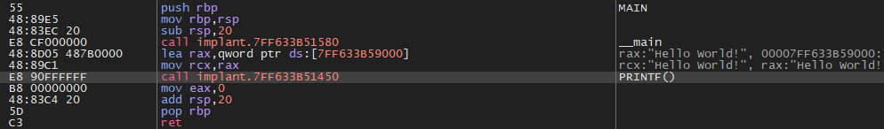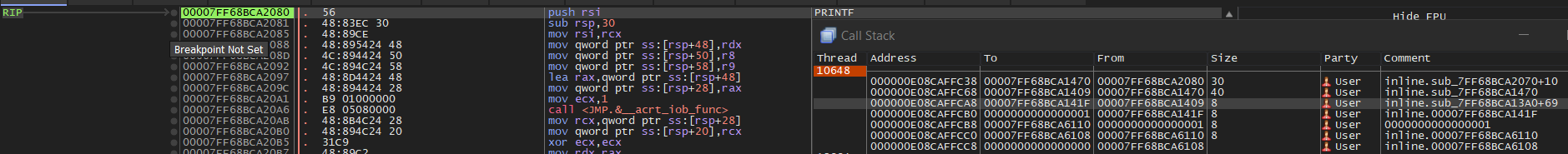 We'll see the following if we open this program in x64dbg and set a breakpoint at the printf() function.