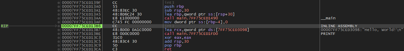 __asm("int3"); // this will set a breakpoint that we'll catch in x64dbg