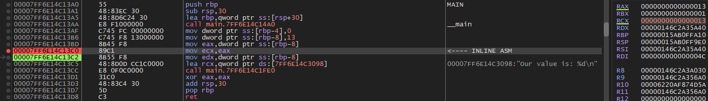 Let's use this syntax to move a variable into an assembly statement. In the code below, we will pass a type int variable into an assembly statement and then move that variable into the ecx register. We'll know we succeeded if we see 0x13 in ecx before our printf statement, and in 0x13 in rcx from our debugger.