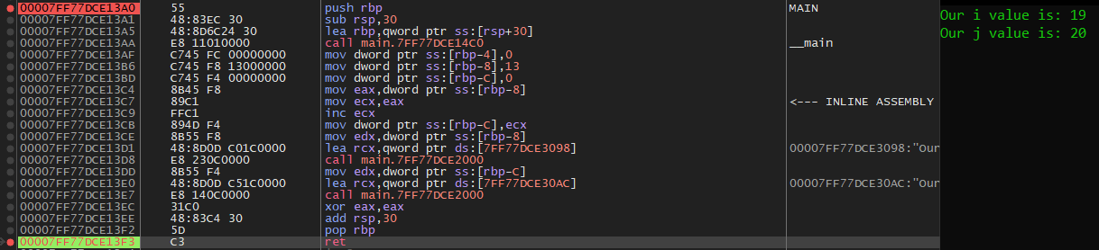 Basic inline assembly can be inserted into a program by calling '__asm("OPERATION");' where 'OPERATION' is a single instruction or a ';' separated set of valid assembly instructions. Let's see what this looks like in implementation.