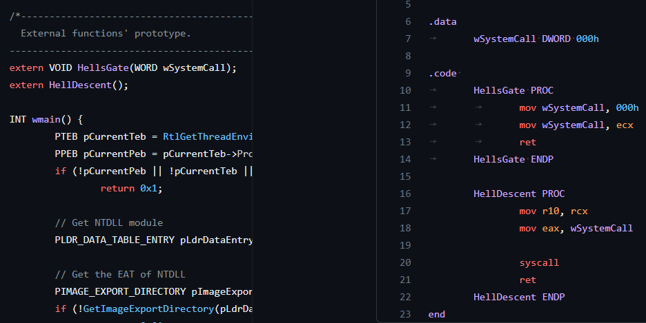 Malware developers using MSVC may also implement assembly in standalone .asm files linked to their program during building. You'll often see it implemented in the manner shown below.