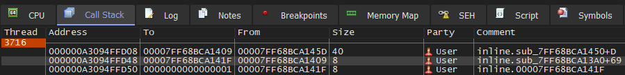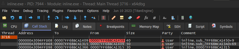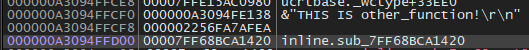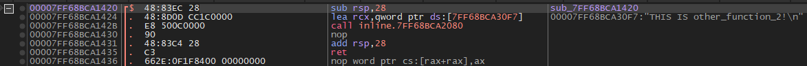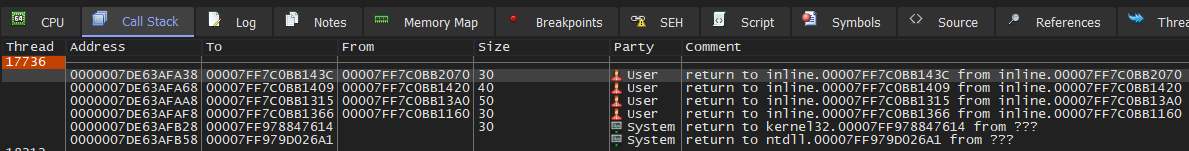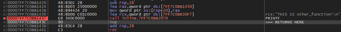 If we follow the "To" address (00007FF7C0BB143C) , we'll be able to see that we're returning to other_function() after the call to printf() as we would expect. Combing through the call stack, we'll see that the calls go main() -> other_function() -> printf().